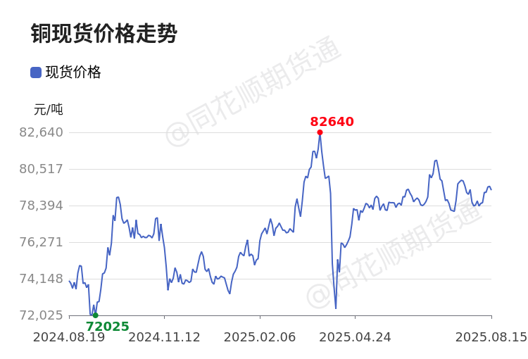 铜现货8月15日已跌至79285.00元/吨,当日跌幅0.28%,周涨幅0.93%,月涨幅1.52%。