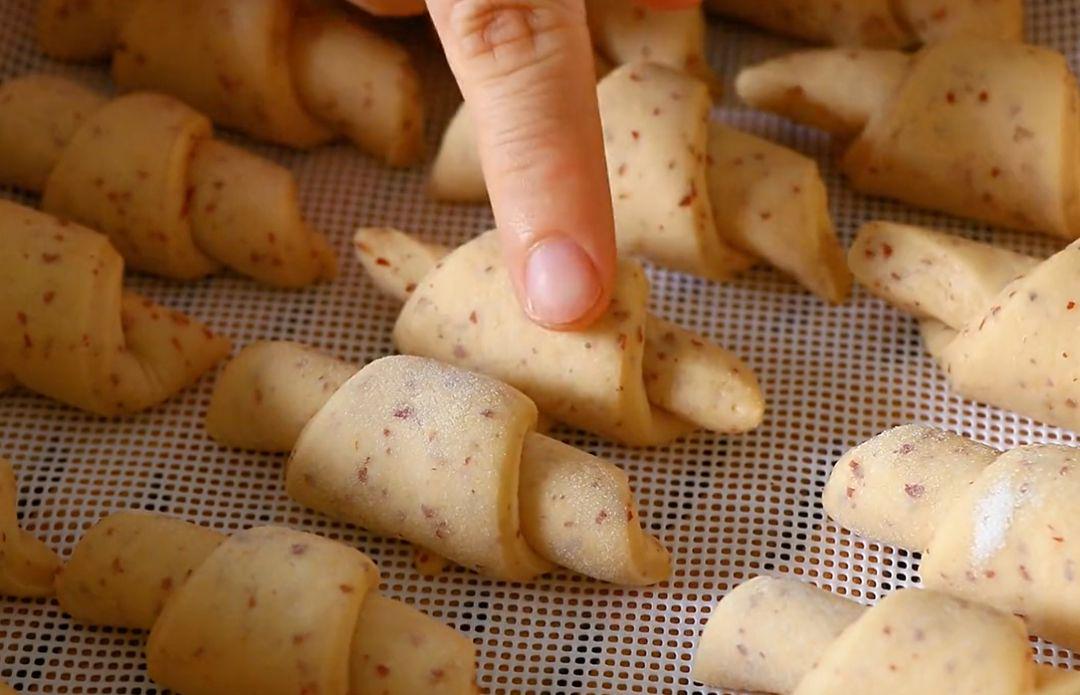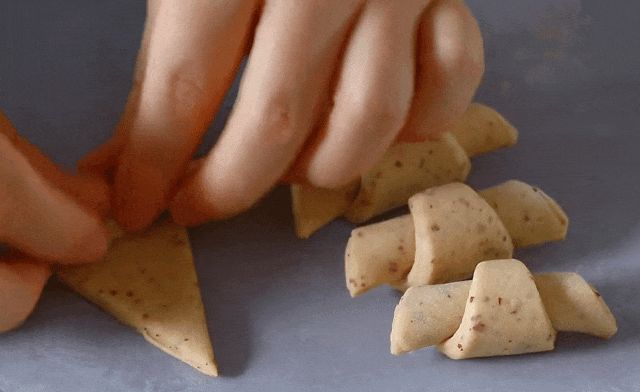2、把面团揉光滑,擀成 5 毫米厚的面片,切成三角形,从宽头卷成牛角状,放在蒸屉醒发半小时。
