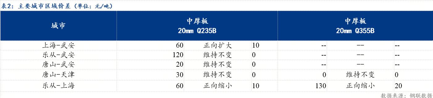 从全国区域价差来看,华南与华北、华南与华东价差持续保持高位,唐山与武安、天津地区中厚板价差在20-30元/吨。