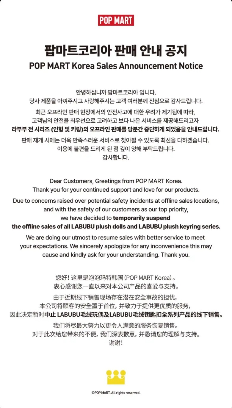 您好!这里是泡泡玛特韩国(POP MART Korea)。由于近期线下销售现场存在潜在安全事故的担忧,本公司将顾客的安全置于首位,并致力于提供更优质的服务,因此决定暂时中止 LABUBU毛绒玩偶及LABUBU毛绒钥匙扣全系列产品的线下销售。我们将尽最大努力以更令人满意的服务恢复销售。对于此次给您带来的不便,我们深表歉意配资猫,并恳请您的理解与支持。