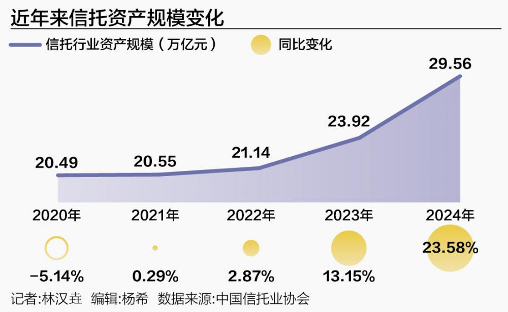 6月3日,中国信托业协会发布的《2024年度中国信托业发展评析》显示,2024年末,67家信托公司管理的信托财产规模达到29.56万亿元,比2023年末增加5.6万亿元,增长23.58%。