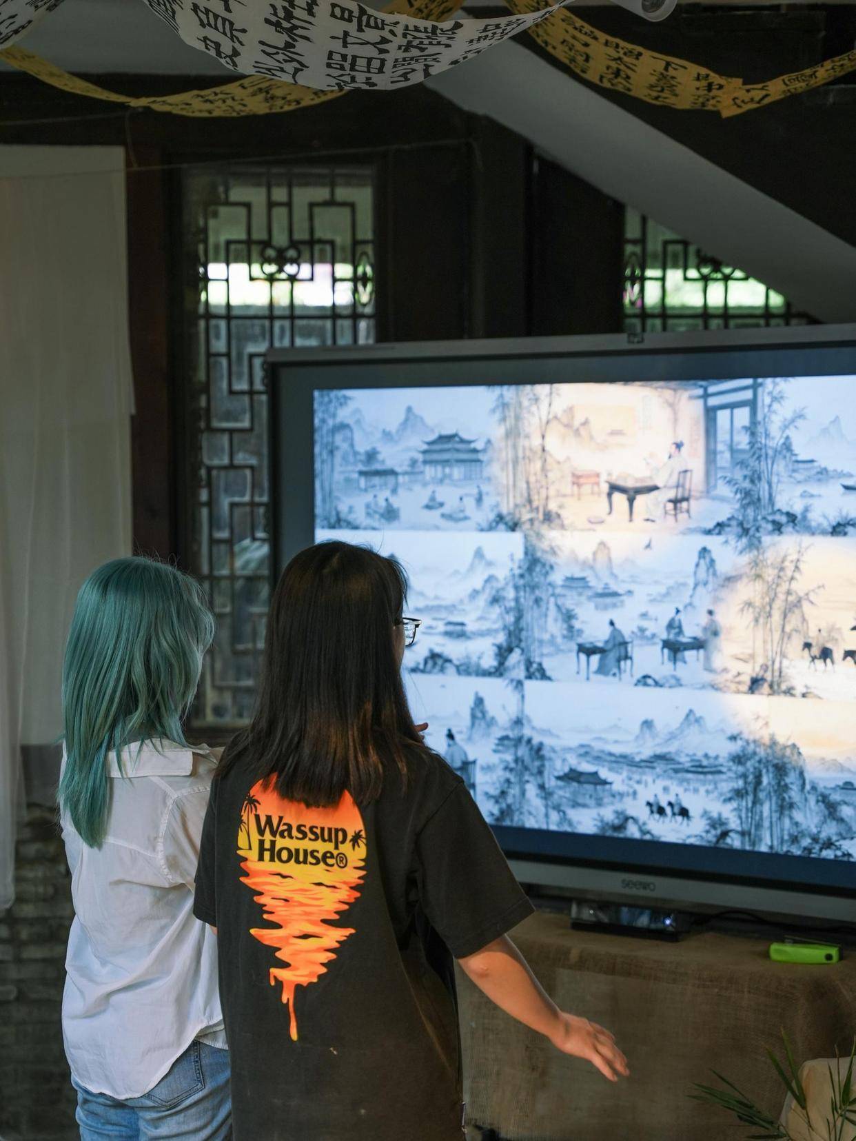 在蓝染艺术展区,特别设置互动环节,游客可亲手参与染布制作双悦网,感受植物染料的自然色泽与手工温度。数字艺术体验区则打造了一个跨越时空的“数境空间”,通过AI算法、自然交互等科技手段,将织品装置、传世名画、古法扎染等文化遗产转化为可交互的动态视觉体验。
