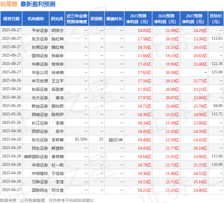证券之星数据中心根据近三年发布的研报数据计算,东北证券李森蔓研究员团队对该股研究较为深入,近三年预测准确度均值高达85.5%,其预测2025年度归属净利润为盈利18.4亿,根据现价换算的预测PE为18.32。